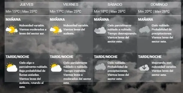El tiempo para este jueves permanecerá inestable, con nubosidad variable y vientos moderados a leves del sector sur. Según el Servicio Meteorológico Nacional (SMN), la mínima para hoy alcanzará los 15°C, mientras que la máxima ascenderá a los 20°C.