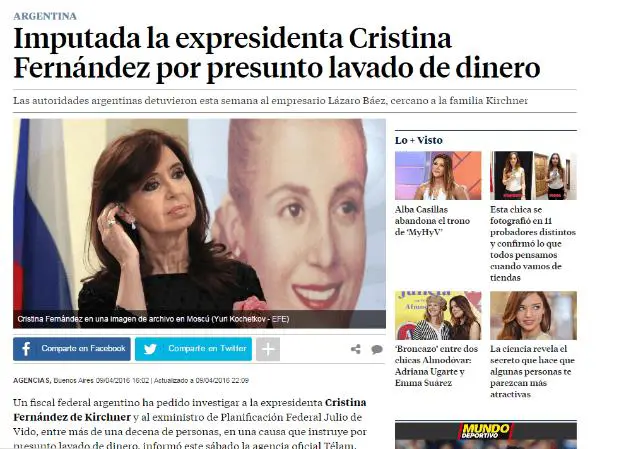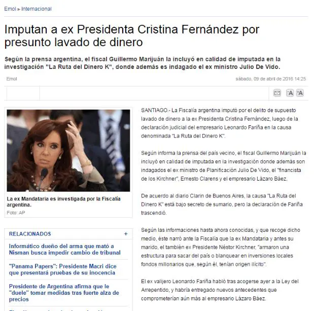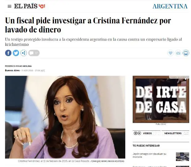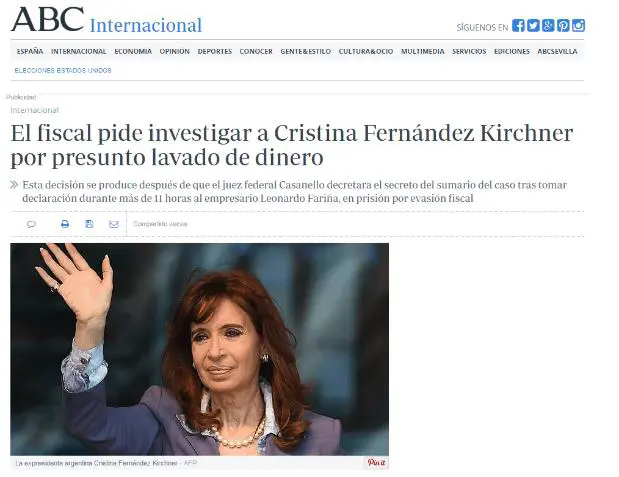 Asimismo, el sitio ABC de España remarcó que “un fiscal pidió investigar a Cristina Fernández Kirchner por presunto lavado de dinero” y el portal La Vanguardia de Barcelona consignó que "las autoridades argentinas detuvieron esta semana al empresario Lázaro Báez, cercano a la familia Kirchner" y retomaron la noticia en la sección "Internacional".