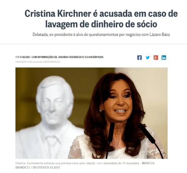 Por su parte, el sitio de noticias de Brasil O'Globo también se hizo eco de la noticia: "Cristina Kirchner é acusada em caso de lavagem de dinheiro de sócio", escribieron. Y explicaron que en la causa están siendo investigados el empresario santacruceño Báez y su ex contador Daniel Pérez Gadín, quienes están presos por orden del juez federal Sebastián Casanello.