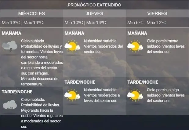 Por la mañana el clima se presentará parcialmente nublado, con vientos leves del sector norte. Por la tarde y la noche hay probabilidad de lluvias y tormentas, con vientos leves o moderados. La máxima podría alcanzar los 26 grados.
