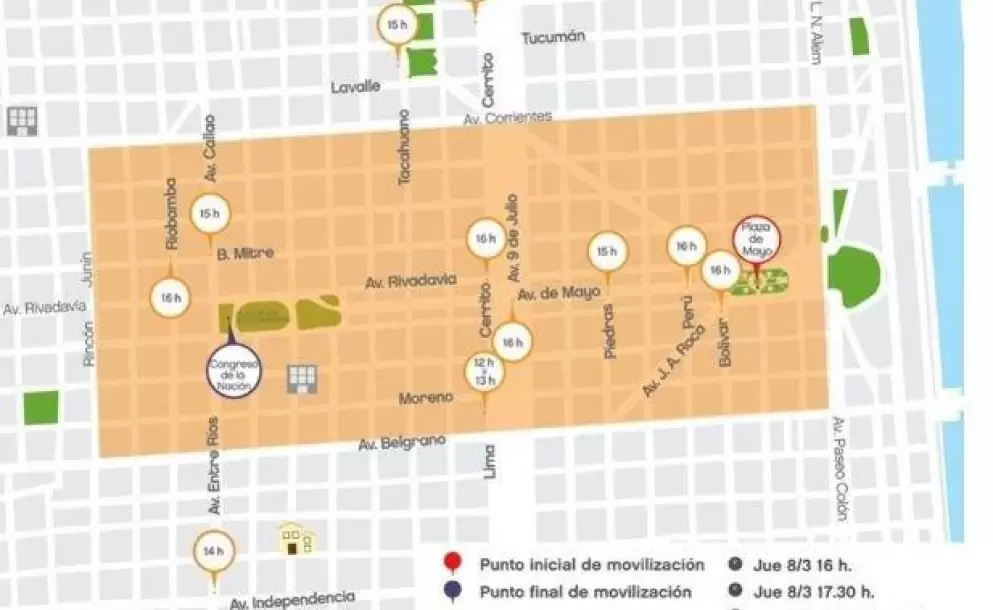 Los cortes de tránsito previstos para esta tarde.El tránsito se verá restringido en el rectángulo conformado entre las avenidas Paseo Colón/Leandro N. Alem y Junín/Rincón; y Belgrano y Corrientes.