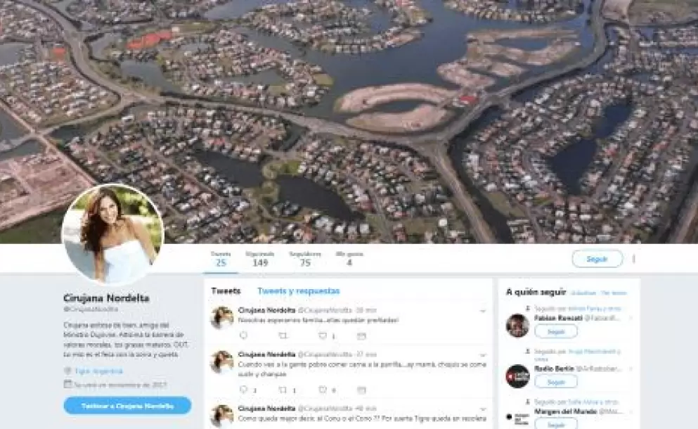 Pero mientras algunos se divierten y otros organizan mateadas masivas contra sus dichos, un internauta -rápido y muy despierto- creo la cuenta de Twitter de la “cheta” de Nordelta. “Cirujana exitosa de bien, amiga del Ministro Dujovne”, reza la descripción de la cuenta.