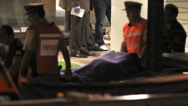 Momento en que retiran el cuerpo del fiscal de su domicilio de Le Park.