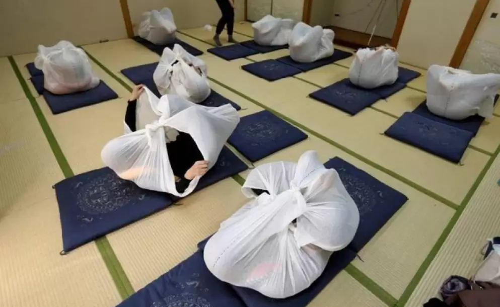 La técnica parece insólita, pero evidentemente es real y, aparentemente, serviría como una especie de terapia “anti-stress”. Consiste en envolverse con una tela para recrear la seguridad que brinda estar en posición fetal.