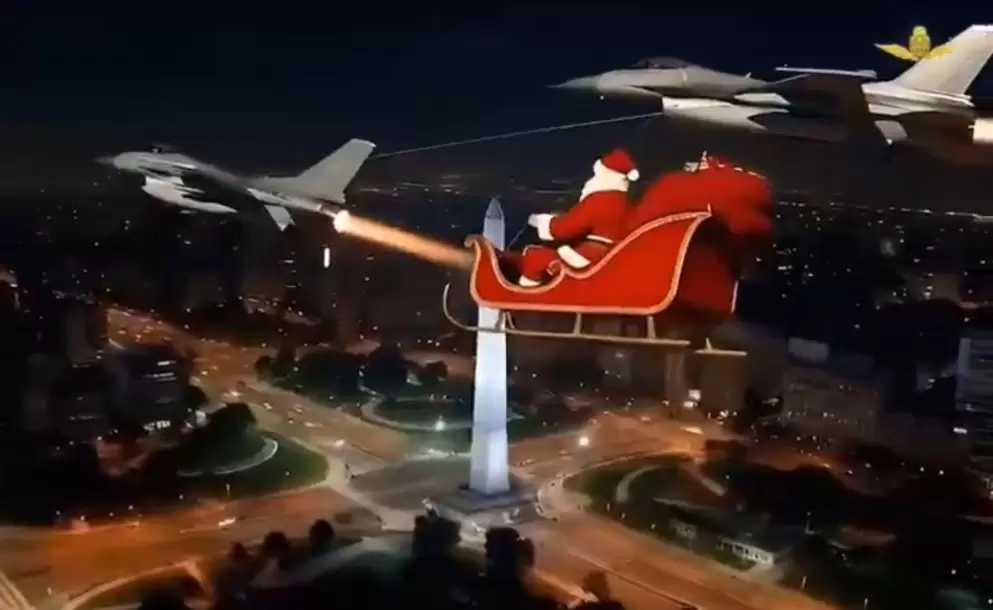 El material mezcla imágenes reales del denominado vuelo ferry que trajo al país a los primeros seis F-16 -con escalas en Zaragoza, las Islas Canarias y Natal- con secuencias generadas por IA. En la edición, los aviones pasan de escoltar a literalmente tirar del trineo, reemplazando a los renos mientras sobrevuelan una Buenos Aires virtual, con el Obelisco incluido. "¡Felices fiestas, familia aeronáutica!", grita Papá Noel antes de desaparecer entre estelas brillantes y pirotecnia digital. Detrás del clima festivo, el video vuelve a poner en primer plano una operación militar que el Gobierno de Javier Milei presentó como un "hito histórico".