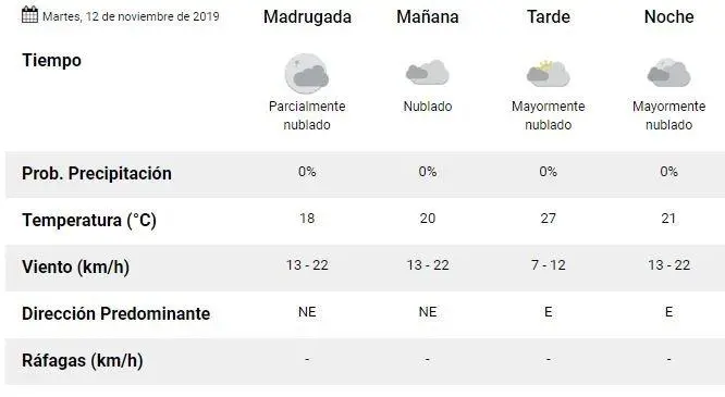 Con una humedad que alcanzará el 83 %, este martes se presentará con muchas nubes en el cielo y una temperatura que irá desde 18 los hasta los 27°C.
