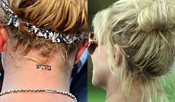 La otrora princesa del pop mundial tiene varios tatuajes de dudoso gusto en su haber. Uno de ellos es un hada bastante mal hecha en los comienzos de su cola, un par de dados rosa en una de sus muñecas (que Kevin Federline, su ex esposo, tenía en color celeste en el mismo lugar), y esta leyenda en hebreo en su nuca que, afortunadamente, decidió borrar, al igual que esos dados locochones.