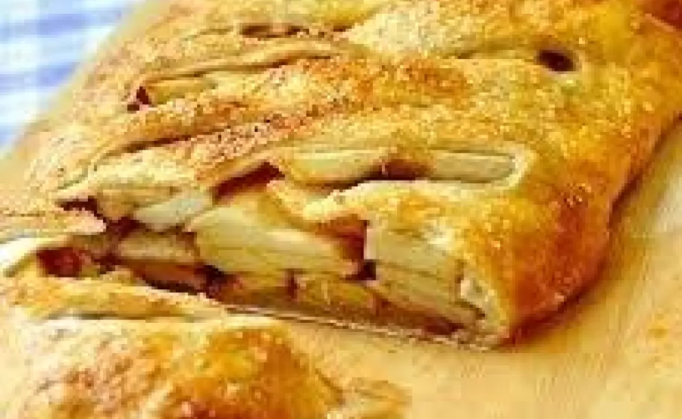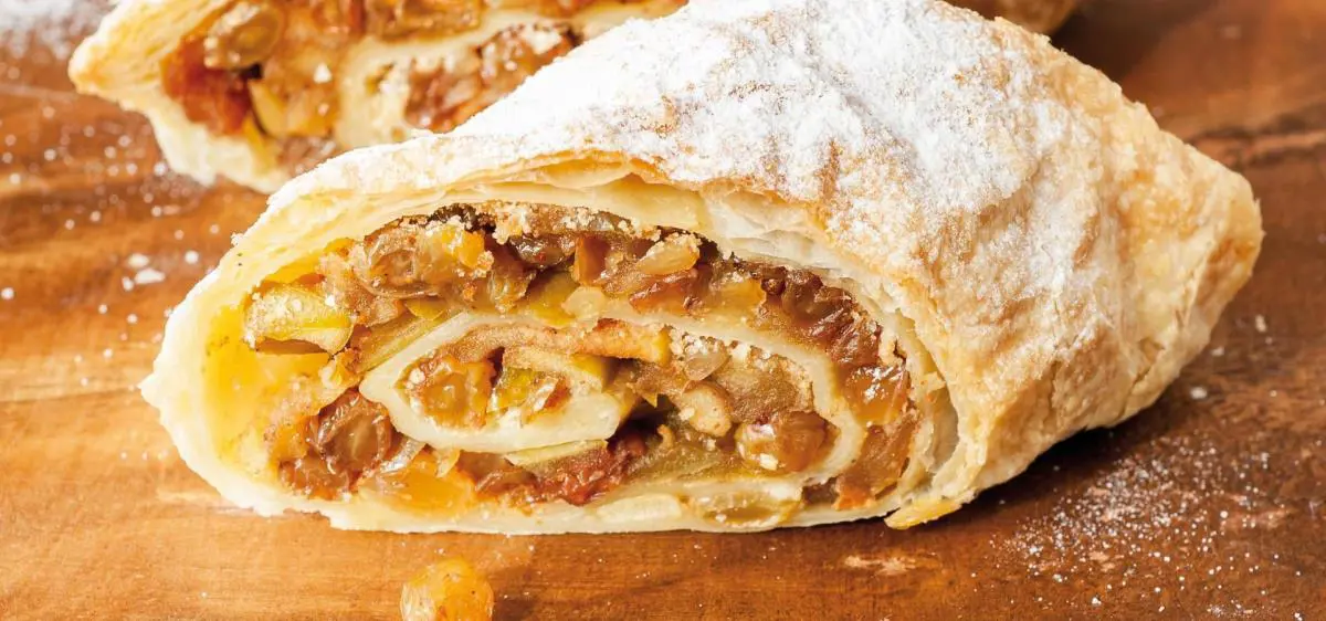 Rellenar con las manzanas, pasas de uva y nueces (frío) y cubrir con el struesel. Para la cocción, cocer al horno medio por 35 minutos.