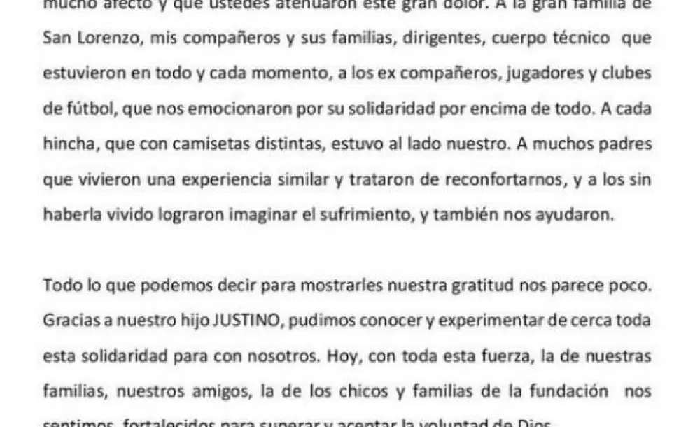 En la carta, Torrico agradece a ex compañeros, clubes y jugadores de fútbol y también a padres que atravesaron el mismo sufrimiento. “Todo lo que podemos decir para mostrarles nuestra gratitud nos parece poco. Gracias a nuestro hijo JUSTINO pudimos conocer y experimentar de cerca toda esta solidaridad para con nosotros”.