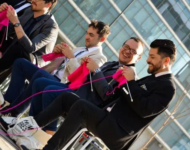 Hombres de negro tejen en rosa.