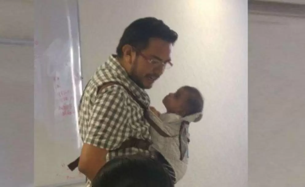 Gabriel, de 7 meses es hijo de una de las chicas de la clase, lejos de pretender que la alumna se vaya, Miguel Segovia, el profesor, lo cargó en brazos y siguió dando las indicaciones al curso. El bebé dejó de llorar y Karla, su mamá pudo terminar la clase. Una de las compañeras de clase subió el video a su Facebook y rápidamente se volvió viral.