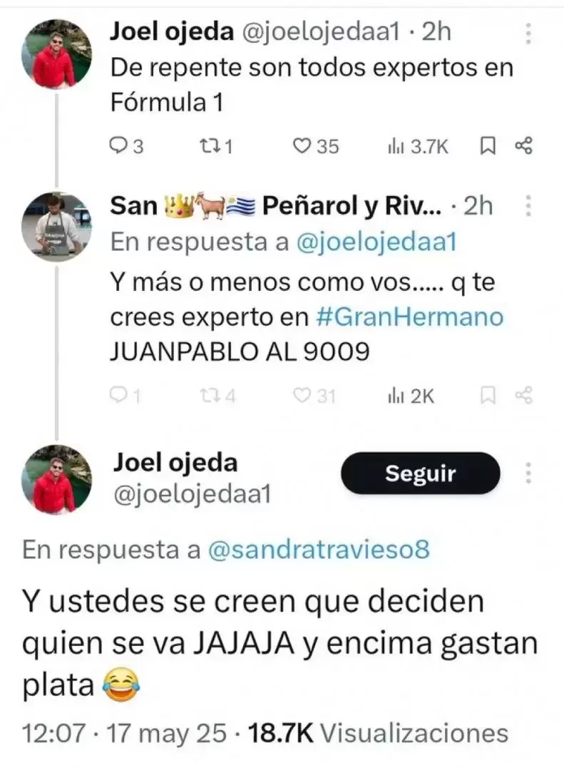 Un usuario no tardó en cruzarlo y cuestionó su autoridad: "Y más o menos como vos... que te creés experto en Gran Hermano", le respondió. Ojeda no se quedó callado y lanzó una frase que sembró dudas sobre la transparencia del formato: "Y ustedes se creen que deciden quién se va JAJAJA... y encima gastan plata", disparó.