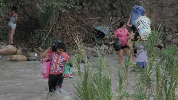 Con sus pertenencias en los brazos, colombianos cruzan el río Táchira para regresar a su país.