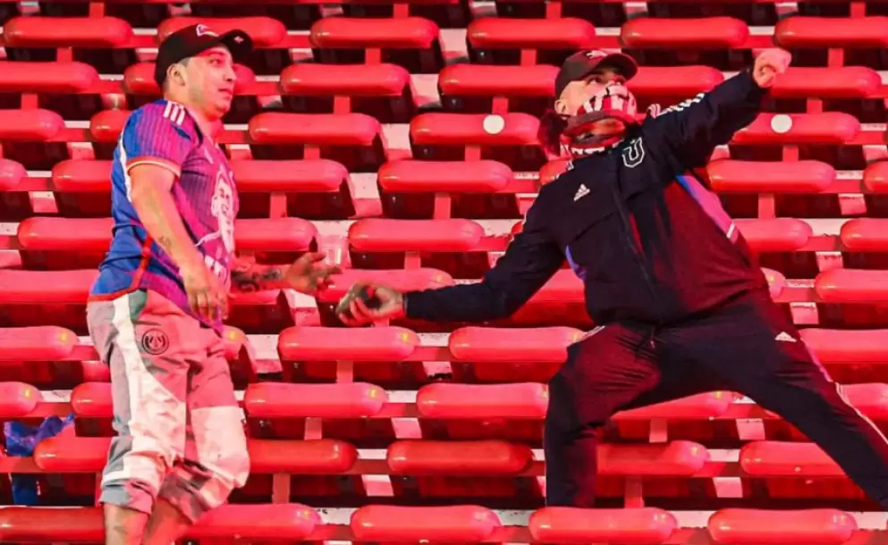 Ubicados en la Sur Alta, los chilenos iniciaron el caos: violentaron un cuarto de limpieza, rompieron baños, arrancaron butacas y convirtieron todo en proyectiles. Desde arriba arrojaron palos de madera, varillas de hierro, botellas, tanto de agua como de fernet, piedras, tapas de inodoro, butacas y hasta bombas de estruendo contra los hinchas locales en la bandeja inferior. Las imágenes mostraron asientos ardiendo, mientras los locales corrían para cubrirse de los ataques.