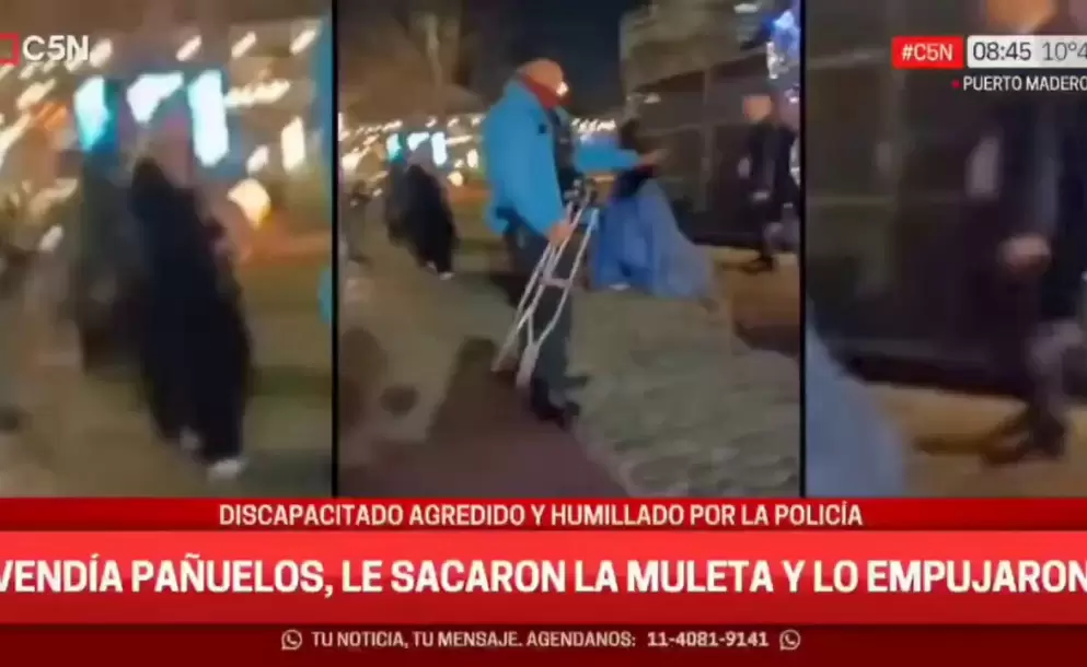 En el material se observa cómo el agente forcejea con un vendedor ambulante discapacitado, al punto de arrebatarle las muletas y empujarlo para hacerlo caer al suelo.