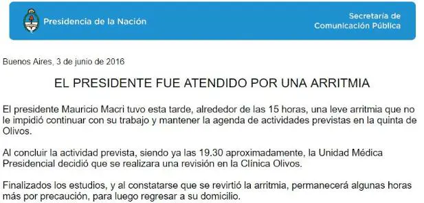 Alrededor de las 23.15, el presidente abandonó la clínica para volver a su domicilio. El director de la Unidad Médica Presidencial, Simón Salzberg, habló con los medios de comunicación y detalló lo sucedido: "Macri sufrió esta tarde una fibrilación auricular, que es una arritmia común".