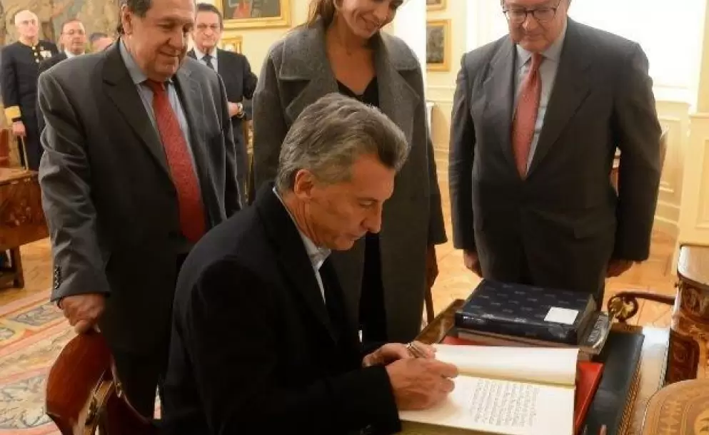 Como una de las primeras tareas protocolares de su visita oficial a España, Mauricio Macri estampó su firma en el libro de visitas del Palacio de El Pardo, una de las residencias de la familia real española, destinada a alojar a los jefes de estado que visitan el país.
