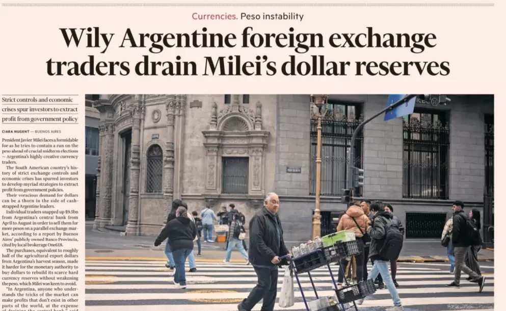 De hecho, el diario toma en cuenta la palabra de Salvador Vitelli, del Romano Group, quien afirmó: "En Argentina, cualquiera que entienda los trucos del mercado puede generar ganancias que no existen en otras partes del mundo, a costa de drenar el Banco Central". La publicación británica advierte que la falta de resultados en la reconstrucción de reservas encendió luces rojas entre los inversores internacionales, generando una ola de venta de bonos y una nueva presión sobre el tipo de cambio. La situación se agravó después de la derrota del oficialismo en Buenos Aires, que "puso en duda el apoyo político a las reformas de libre mercado de Milei".