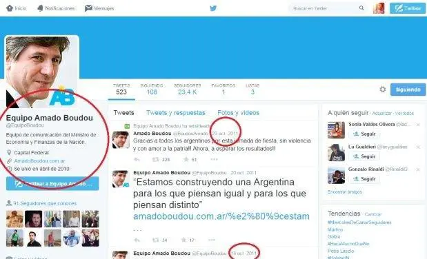 Tiempo antes, su equipo de asesores abrió la cuenta @EquipoBoudou, que nunca recibió demasiadas actualizaciones. De hecho, esa cuenta aún se refiere a Boudou como ministro y no como vicepresidente, y su última publicación es de octubre de 2011.