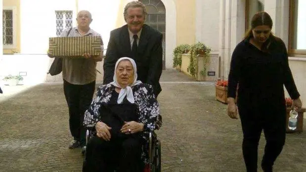 El Papa Francisco abrió las puertas de su residencia oficial en Santa Marta para mantener hoy un encuentro privado con Hebe de Bonafini. La titular de Madres de Plaza de Mayo llegó hasta allí en silla de ruedas acompañada por un pequeño grupo de colaboradores.