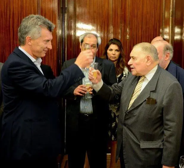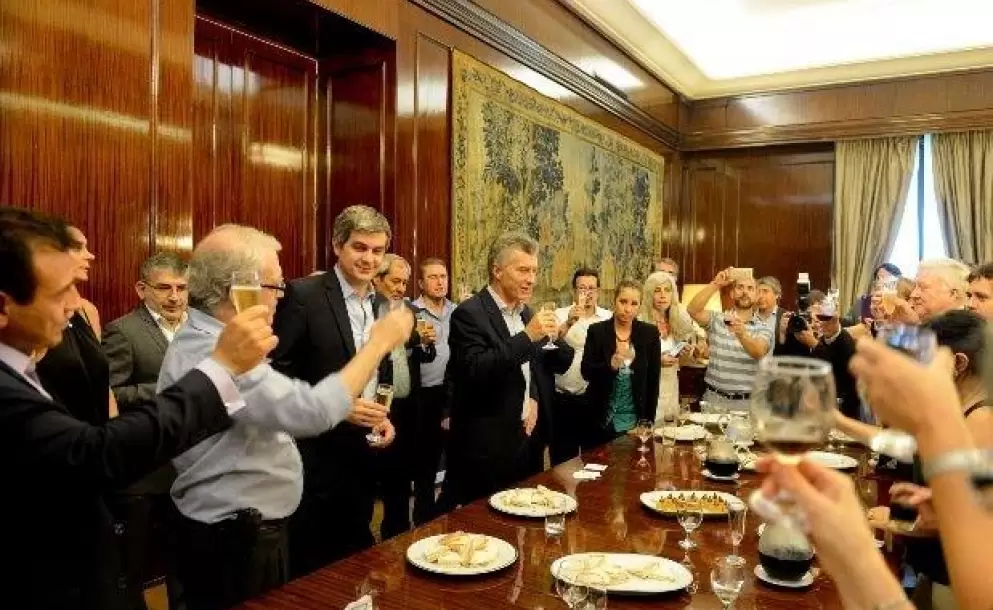 “Recuperamos este espacio de tranquilidad y respeto”, dijo Macri, con una copa de champagne en la mano y antes los periodistas acreditados, en la sala de conferencias de la sede del gobierno nacional.