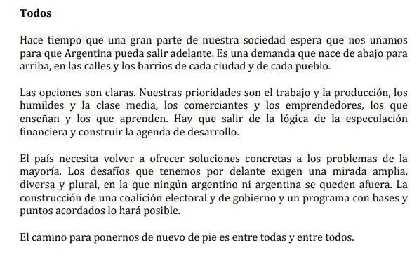 “Hay que salir de la lógica de la especulación financiera y construir la agenda de desarrollo. El país necesita volver a ofrecer soluciones concretas a los problemas de la mayoría. Los desafíos que tenemos por delante exigen una mirada amplia, diversa y plural, en la que ningún argentino ni argentina se queden afuera”, señala el escrito al que accedió BigBang.