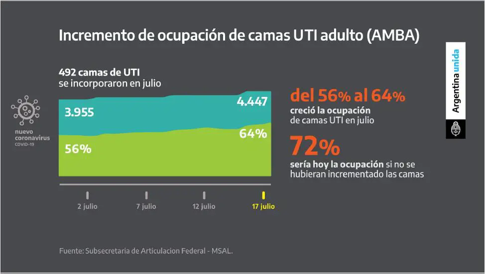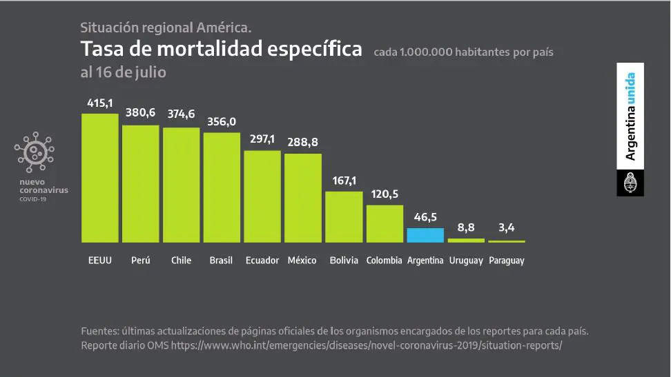 Otro dato que entusiasmó al presidente es la disminución de la tasa de letalidad.Al mismo tiempo, el aumento en la cantidad de camas que permitió la cuarentena estricta, permitió bajar los índices de ocupación a entre un 56 y un 64 por ciento. Por otro lado, la tasa de incidencia acumulada sigue siendo de las más bajas del continente: 253 habitantes cada 100 mil. Por otro lado, además, la tasa de mortalidad argentina es una de las más bajas del continente: 46,5 personas por cada millón de habitante, mientras que en Estados Unidos se eleva a 415 personas o en Perú a 380.