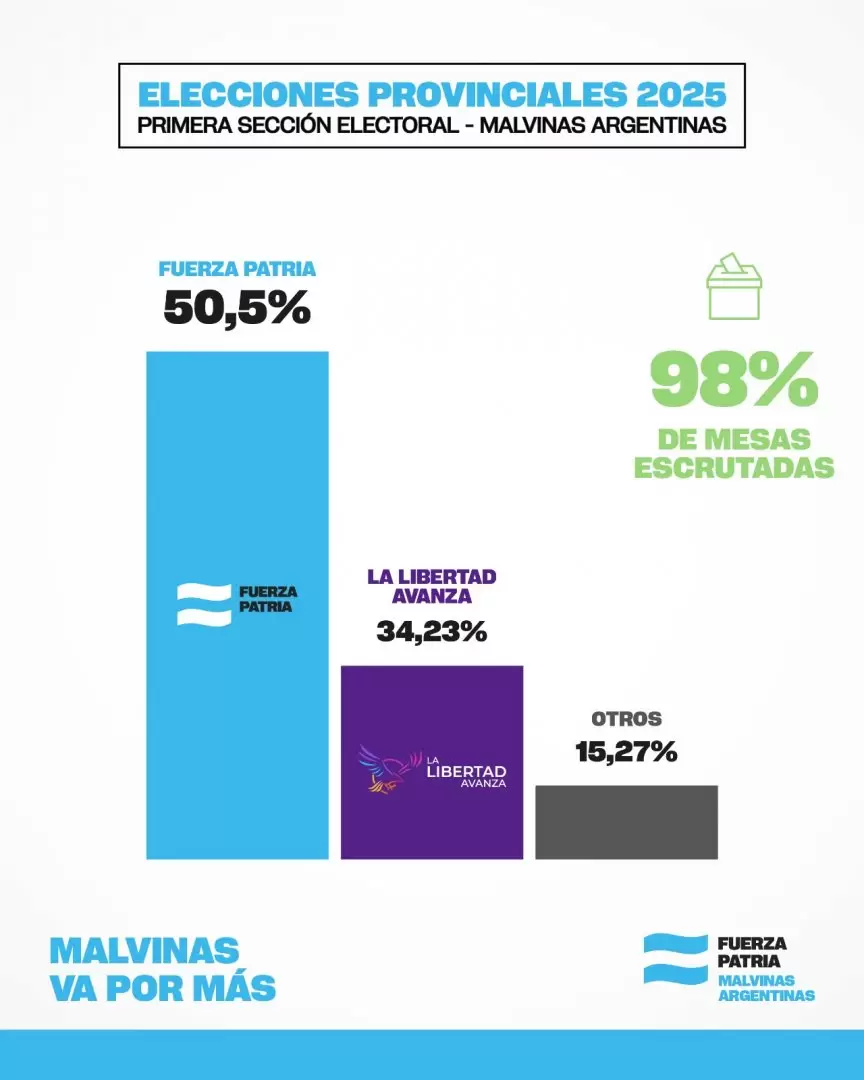 Con el 98% de las mesas escrutadas, la lista Fuerza Patria obtuvo el 50,5% de los votos, mientras que La Libertad Avanza alcanzó el 34,23%. En un contexto nacional y provincial adverso, Malvinas reafirma la confianza popular y proyecta hacia adelante un modelo de gestión que encabeza Nardini, siendo una de las mejores elecciones de Fuerza Patria en toda la provincia de Buenos Aires.