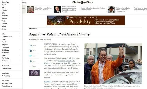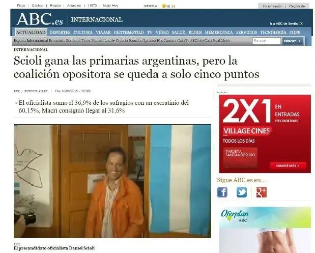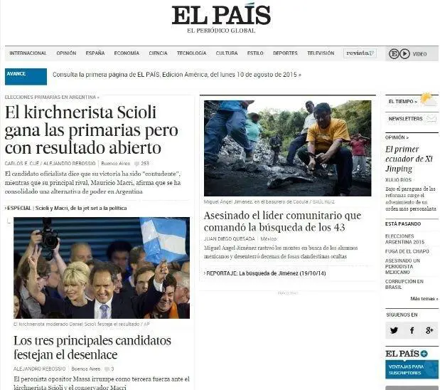 Y las criticas continuaron. En el diario El país, de España, titularon: “El kirchnerista Scioli gana las primarias, pero con resultado abierto”. A modo informativo contaron sobre el largo domingo electoral.