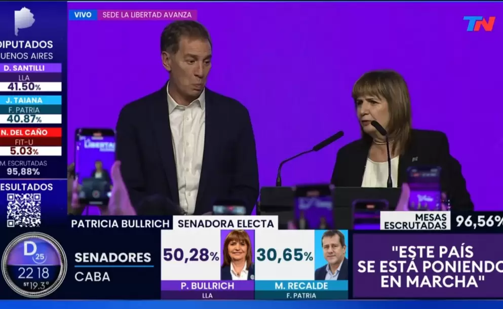 Luego de una hora y media de conocerse los resultados de la contundente victoria de La Libertad Avanza (LLA) en estas elecciones legislativas, Patricia Bullrich salió a hablar públicamente desde el búnker de La Libertad Avanza: "Queridos porteños, queridos argentinos, gracias por la confianza, por el coraje, por la esperanza. Gracias por todos los que hoy creen que este país puede cambiar que el esfuerzo tiene sentido y que se reconoce que la ley se cumple enserio y que la libertad requiere este orden que estamos llevando a delante", comenzó. La ministra superó en la Ciudad de Buenos Aires se impuso con el 50,43% de los votos.