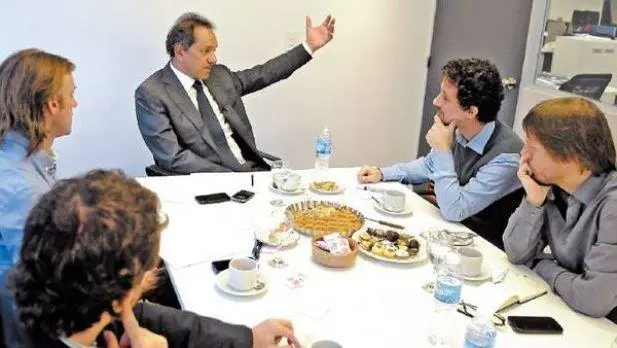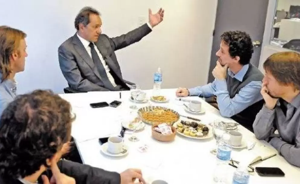 El candidato presidencial del FPV, Daniel Scioli, estuvo en el Diario Clarín para una entrevista con sus periodistas. Con toda la carga simbólica que esa presencia acarrea, el actual gobernador bonaerense se presentó ante los entrevistadores de la sección “Un café con...” con una pastafrola de batata (su debilidad) para acompañar la infusión y una pregunta-chicana amable: “¿Vieron que vine?”. Según el matutino, llegó acompañado de su vocero y sus secretarios.
