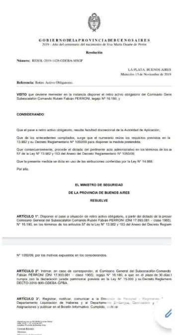 El ministro aceptó el pedido de Perroni mediante una resolución en la que también lo intimó a presentar una declaración jurada patrimonial en el plazo de 30 días, tal como lo establece la ley provincial. Perroni, de 54 años, había sido nombrado oficialmente al frente de la fuerza de seguridad provincial en mayo del 2017, aunque venía ejerciendo el cargo de manera interina desde unos meses antes, tras la renuncia del anterior jefe, comisario general Pablo Bressi.