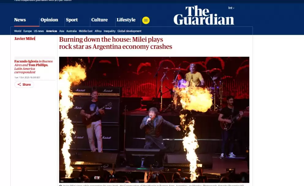 El prestigioso diario británico The Guardian volvió a poner a Javier Milei en el centro de la escena internacional con una nota demoledora sobre el bizarro espectáculo musical que el presidente libertario encabezó en el Movistar Arena, antes de presentar su libro La Construcción del Milagro. Bajo el título "Quemando la casa: Milei se hace pasar por estrella de rock mientras la economía argentina se desploma", el medio describió el evento como un intento de escape de un mandatario acorralado por la crisis, el descontento social y los escándalos de corrupción que golpean a su gobierno. "El 'presidente estrella de rock' de Argentina, Javier Milei, ha tenido dificultades para obtener mucha satisfacción últimamente", comienza el artículo, en alusión al colapso económico y político que atraviesa su administración.