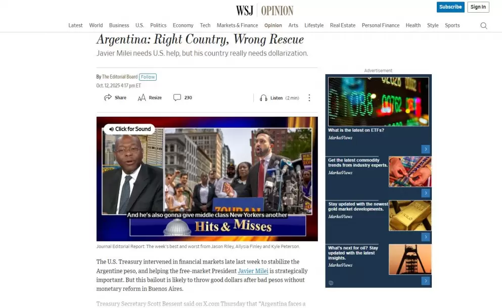 En un momento político y económico clave, el gobierno de Javier Milei volvió a quedar bajo la lupa internacional. The Wall Street Journal, uno de los periódicos financieros más influyentes del mundo, publicó un editorial demoledor contra la estrategia económica del oficialismo y el reciente rescate estadounidense, reclamando abiertamente la dolarización de la economía argentina. El texto, titulado "Argentina: país correcto, rescate equivocado", fue publicado en la edición del domingo, justo antes de la visita del mandatario argentino a Washington para reunirse con Donald Trump. En el artículo, el consejo editorial del diario advierte que "ayudar al presidente pro-mercado Javier Milei es estratégicamente importante, pero es probable que este rescate tire dólares buenos tras pesos malos sin una reforma monetaria en Buenos Aires".