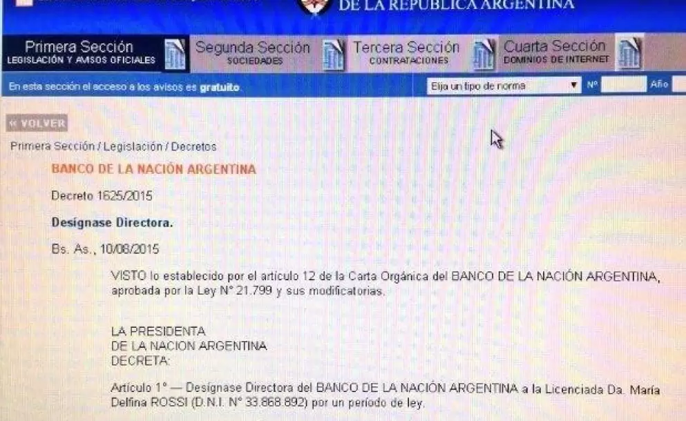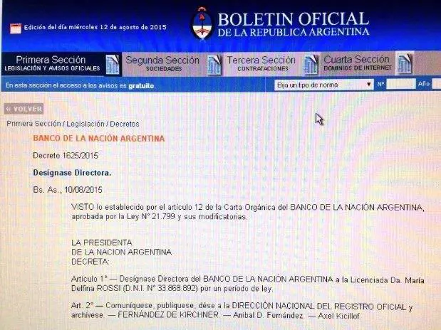 A través de un decreto firmado por la presidenta Cristina Fernández, se nombró a María Delfina Rossi, la hija del ministro de Defensa Agustín Rossi como una de las directoras del Banco Nación. La decisión lleva, además, la firma de Axel Kicillof.