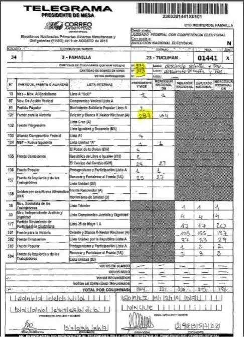 Tristán señaló que no es viable que los empleados del Correo Argentino hayan manipulado el telegrama “entre el momento de la firma y la inclusión del mismo dentro del sobre por parte del presidente de la mesa, y el momento de la transmisión de ese telegrama a la sede del correo donde estaba el ingreso de los datos”.
