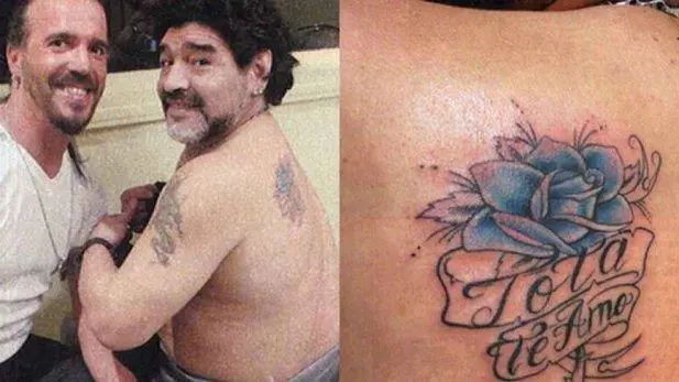 A mediados de 2011, antes de a viajar a Dubai para asumir la conducción técnica del Al Wasl, el ex DT de la selección se tatuó una rosa dedicada a su madre, Dalma Salvadora Franco, quien atravesaba un delicado estado de salud y se encontraba internada en el sanatorio Los Arcos, de Palermo. “El 10” se tatuó una rosa turquesa en la zona dorsal, acompañada de una inscripción que dice “Tota, te amo”. Su tatuador personal, Mariano Antonio, dijo sobre la obra: "tenía un dibujo descolorido y lo arreglamos con esta rosa y una frase que se refiere a su mamá”. Por su parte, Diego agregó: "de mis amores, sólo faltaba tatuarme el de la Tota".