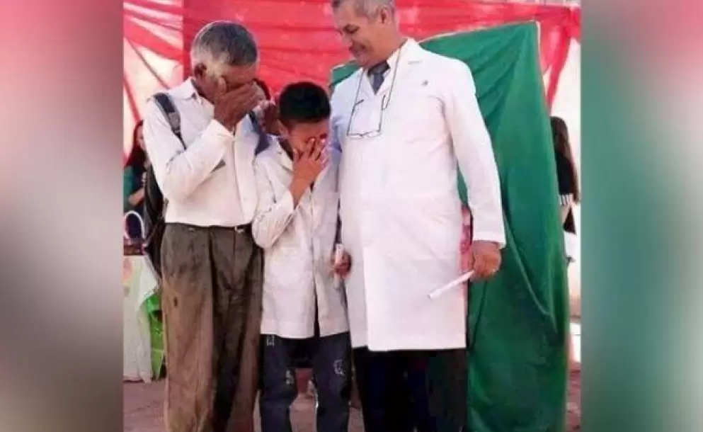La fotografía de la ceremonia de egreso, que alguien tomó con un celular, hace llorar a cualquiera. En ella se puede ver a Efraín junto a su abuelo Ángel, de 70 años, ambos llorando, con el mismo gesto y la misma emoción. Quien está con ellos es el director del colegio, Hugo Baricheval, muy orgulloso.
