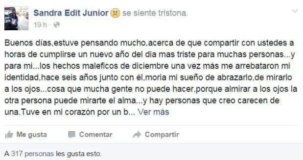 Según la versión de Sandra, su identidad fue “arrebatada” en los “hechos maléficos de diciembre”, en alusión a la resolución judicial que le puso fin al juicio por paternidad que inició en 2008. “Una vez más me arrebataron mi identidad. Hace seis años moría junto con él mi sueño de abrazarlo, de mirarlo a los ojos, algo que no mucha gente puede hacer, porque al mirar a los ojos, la otra persona puede mirarte el alma. Y hay personas que carecen de una”, denunció.