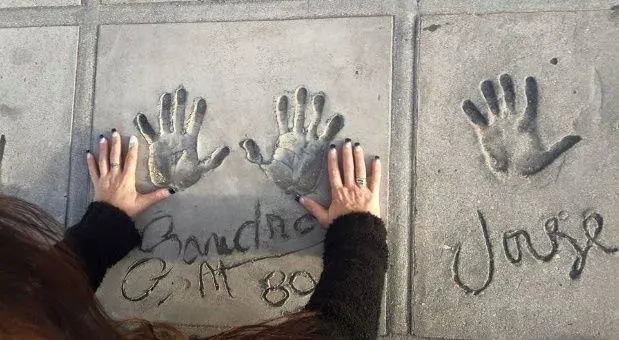 Sandra pone sus manos al lado de la vereda que rinde tributo a su padre en Mar del Plata.