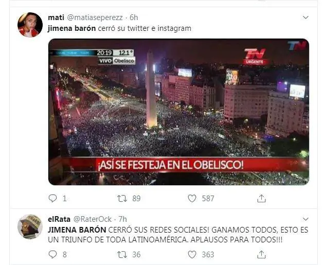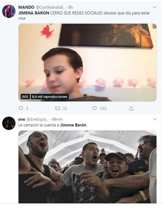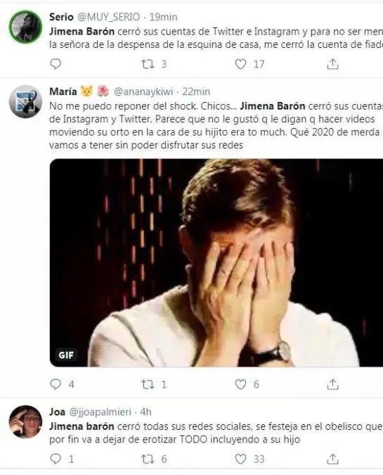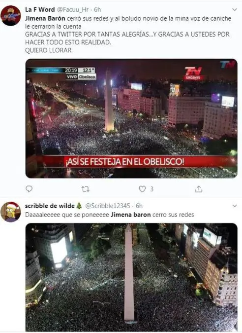 Con más de 38 mil tuits dedicados a ella, Jimena Barón es al momento de publicarse esta nota la principal tendencia en Twitter. La razón es curiosa: gran cantidad de tuiteros expresan de una manera u otra su algarabía por el simple hecho de que la voluptuosa cantante y actriz cerró sus cuentas en esa red social.
