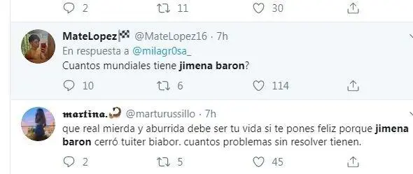 Al día siguiente, molesta por las críticas, escribió: "Feliz Navidad a todos y todas. Ojalá estén con las birras nuevas en el freezer, dándole duro a las sobras y riendo fuerte. ¡A usted hater también le deseo eso! Venga ese abrazo, cabeza de termo". Pero al ver que los cuestionamientos de índole personal no se detenían en ningún momento, Jimena cerró -tal vez sólo por un tiempo: ya se sabrá- su cuenta personal de Twitter para escaparle a las críticas y a las agresiones.