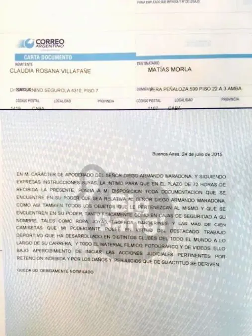 La carta fue enviada esta mañana por el abogado y apoderado de Maradona, Matías Morla. Y llegó a la dirección que El Diez y Villafañe compartieron en sus años como pareja: Segurola 4310, séptimo piso. Esa misma dirección que quedó inmortalizada por la frase que Diego le gritó a Julio César “Huevo” Toresani años atrás, en medio de una pelea.