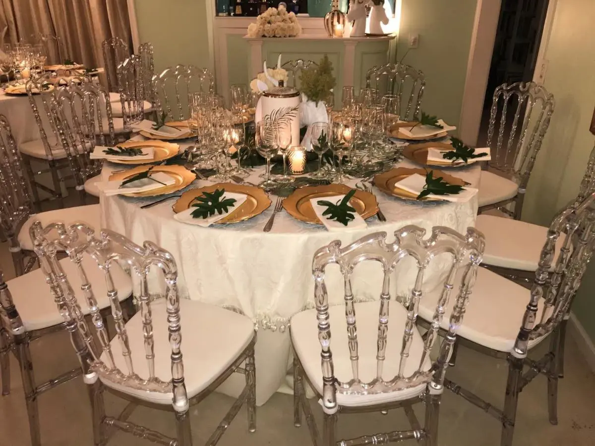 La celebración número 93 de las hermanas contó con mesas circulares decoradas en blanco y verde, sillas Napoleón transparentes, velas, rosas blancas y follaje natural. El menú incluyó variedad de carnes y pescados y risotto.