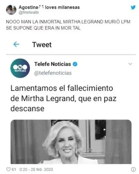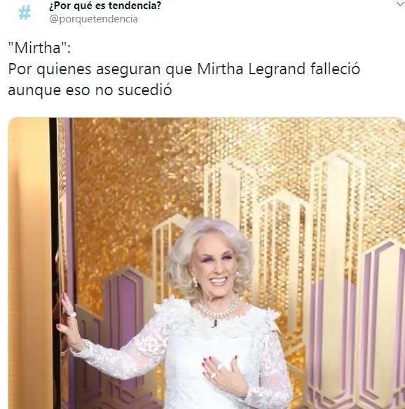 A pesar de los cientos de comentarios que daban por muerta a la conductora, lo cierto es que Mirtha no murió y se trató solo de una broma de mal gusto, o de un tremendo erro.
