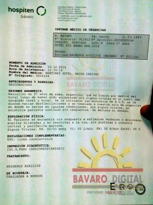 El portal de noticias de Bavaro Digital, de Punta Cana, publicó el primer informe médico que se le realizó sobre el hermano de Nicolás Vázquez luego de ser atendido por los médicos locales. En el documento se informa que el ex Esperanza Mía fue encontrado en el suelo de su habitación “sin signos vitales y con sangrado nasal y bucal”.