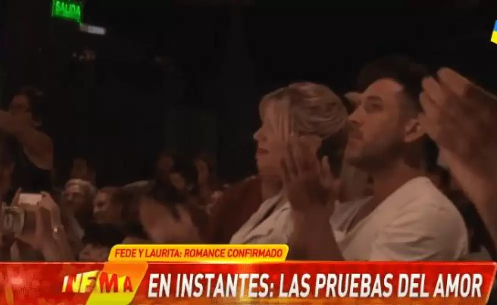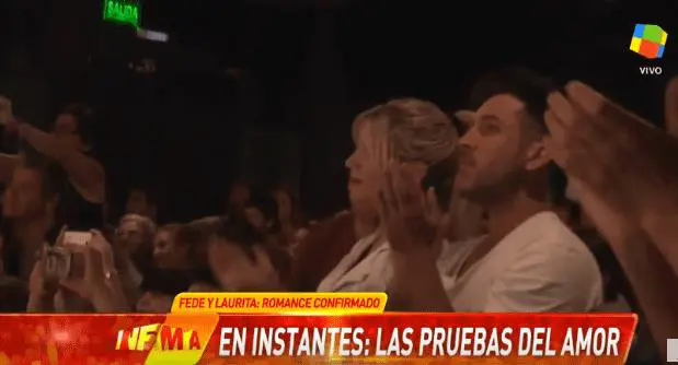 Las cámaras de Infama captaron el momento justo en el que ella saluda a su ex pareja de baile al finalizar la obra y le lanza un romántico “te amo” mientras aplaude la función de pie. Mientras tanto su (¿pareja?) saludaba al publicó junto a Florencia de la V, Emilio Disi, Osvaldo Laport, Virginia Gallardo, y Ailén Bechara, entre otros.