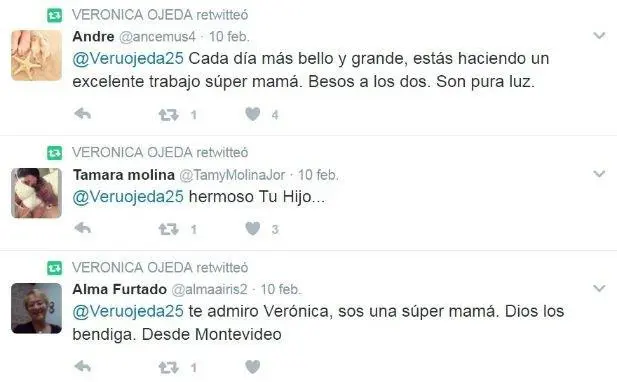 “No le des de comer a la Oliva, es una impresentable”, reza uno de los comentarios que Ojeda compartió en su timeline de Twitter. “Justo esa impresentable habla así. Debe lavarse la boca antes de nombrarte, sos una mamá 10 puntos”, agrega otro usuario que, claro, se ganó el RT inmediato de Verónica.