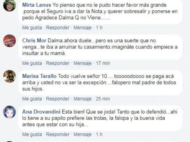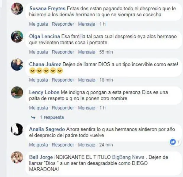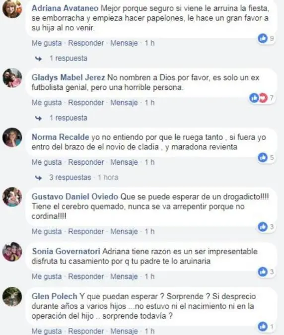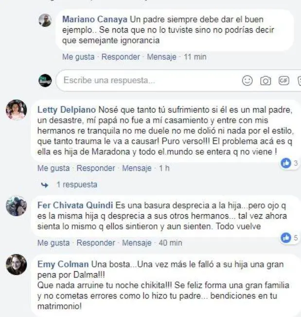 Lo cierto es que, mientras Maradona sigue en los Emiratos Árabes entrenando a su equipo, el Al Fujairah -como si no fuera inminente la boda de la joven a la que bautizó Dalma Nerea- una parte del país acumula bronca en su contra. Tal vez no sean todos los lectores de BigBang, pero sí la abrumadora mayoría de los que postean comentarios en redes sociales. Con respecto a Dalma, los comentarios varían: algunos lamentan su situación, otros le reprochan su indiferencia para con sus medio hermanos Diego Armando, Jana y Diego Fernando. Con Diego, en este momento, el enojo parece casi unánime. Veamos.