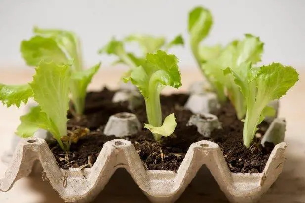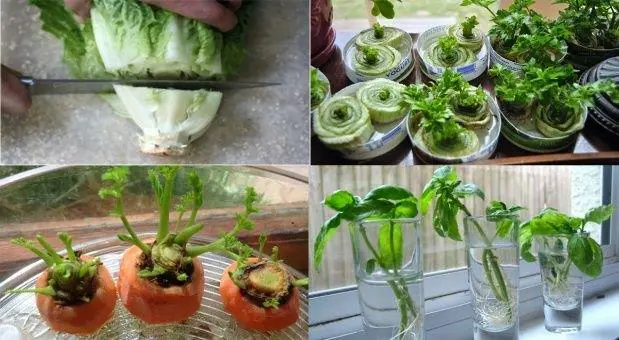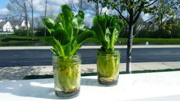 Remové la parte inferior de la cabeza de lechuga y colocala en un pequeño cuenco con agua. Las nuevas hojas nacen desde el centro de la planta en tan sólo 3 días, y se obtiene una nueva media cabeza de lechuga en aproximadamente 2 semanas. La variedad de lechuga romana vuelve a crecer mejor, pero hay que hacer la prueba con todas.